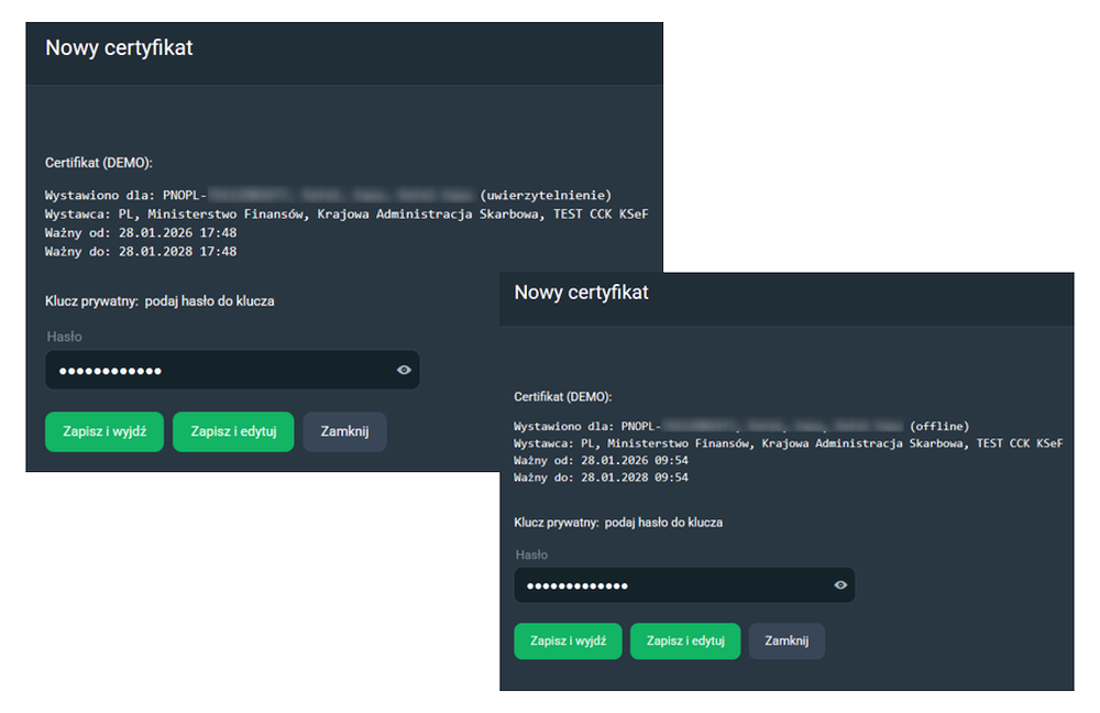 - Plik .key – klucz prywatny potwierdzający uprawnienia wraz z hasłem. System posiada wbudowany mechanizm, który automatycznie sprawdza poprawność pary kluczy podczas ich dodawania